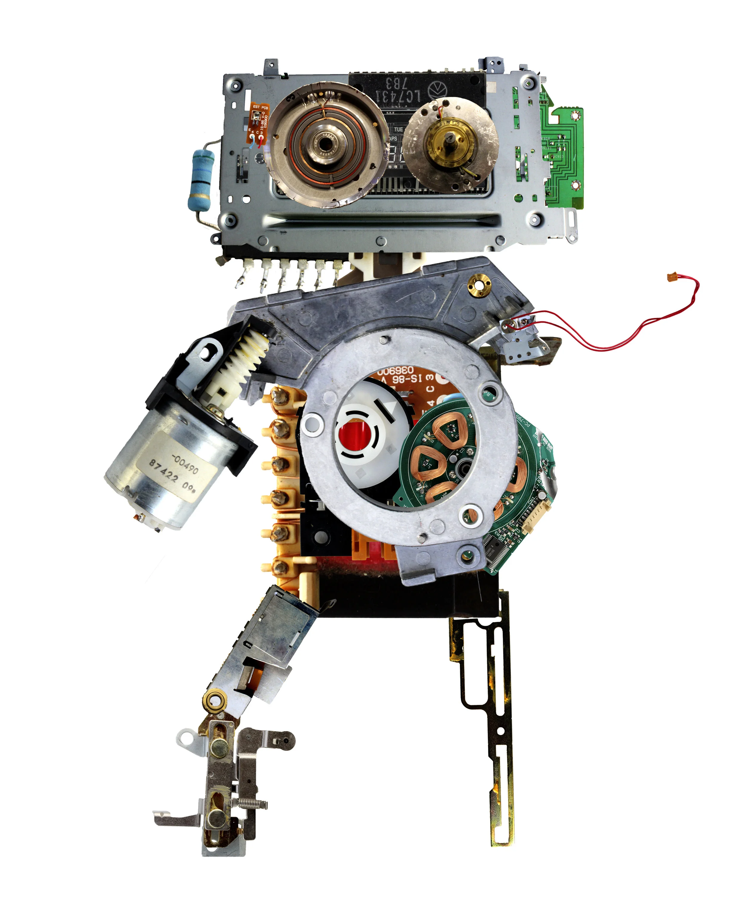 This photo reconstruction is a project that I created in school. This robot is created from multiple different pictures of VCR parts. The story that I gave my robot is that he is a little robot war veteran that received some injuries from war.