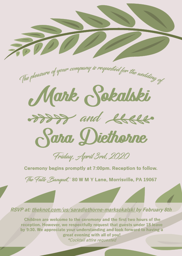 This is a freelance project that I created for a wedding. The theme was a spring theme so I went with some lighter elements with a focus on the pictures and text. For the invitation I illustrated some leaf elements to tie into the Save the Date photo, but not to over power the information.