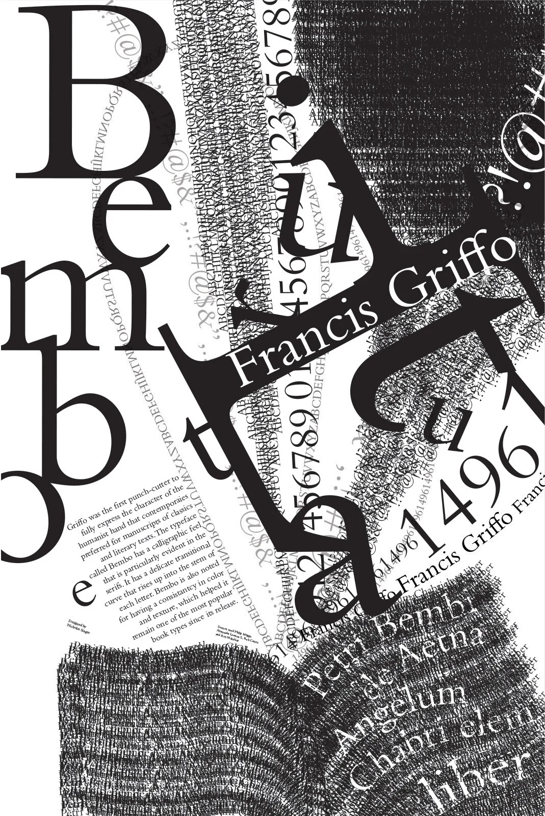 This typographic poster is a project that I created in school. I was given the font Bembo for this project. I show the font’s literary origins by including a book made of characters releasing some information about the font and many other letters.